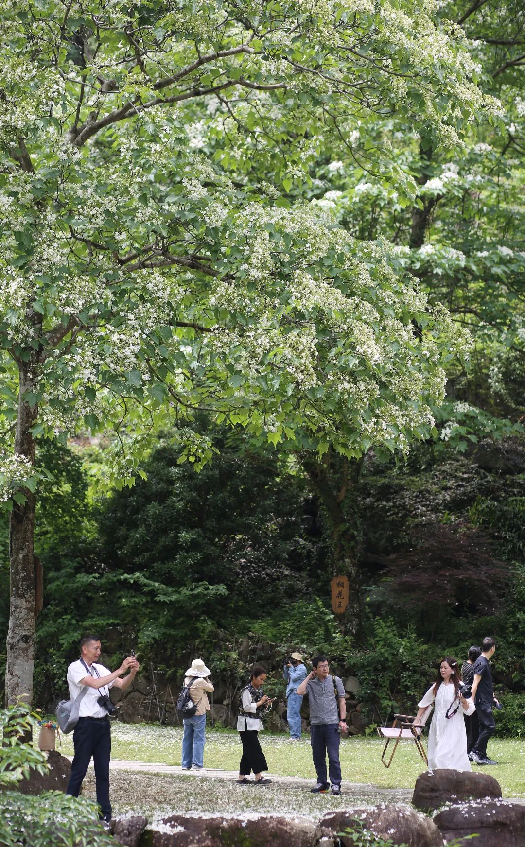 灵峰景区中,桐花从入口一路绽放到最深处。沿着蜿蜒的山路前行,清风徐来,白色的桐花随风飘落,洒在肩头,是大自然给予的温柔抚摸。