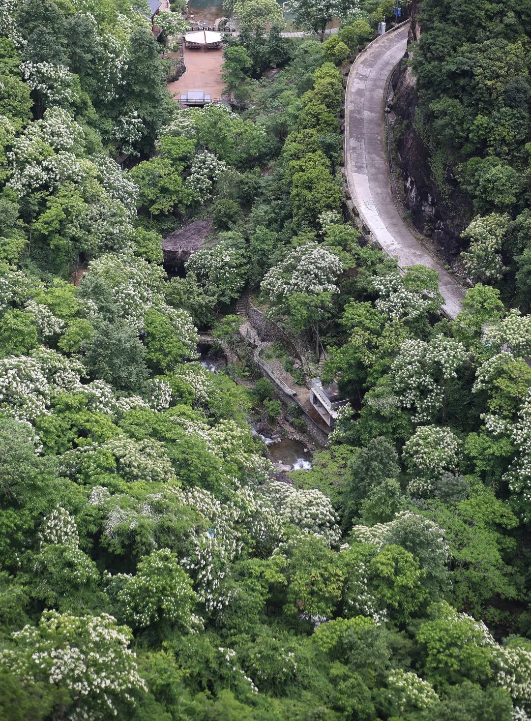 沿着登山道拾级而上,一路上溪涧清澈,流水淙淙,奇峰林立,岩洞争幽,瀑布飞泻。站在高处俯瞰,整个桐花谷尽收眼底,漫山的繁花似雪飘飞,壮观又美丽。