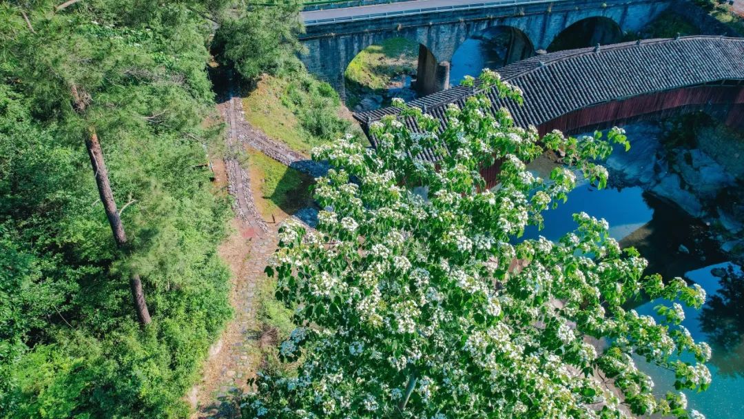 行至仙居廊桥,古朴的廊桥与周边的桐花、溪水、飞鸟相映成趣,勾勒出一幅充满古韵的山水画卷。站在廊桥之上,看桐花随风落入溪中,随波流转,耳边是潺潺的流水声,仿佛时光都在此刻慢了下来。