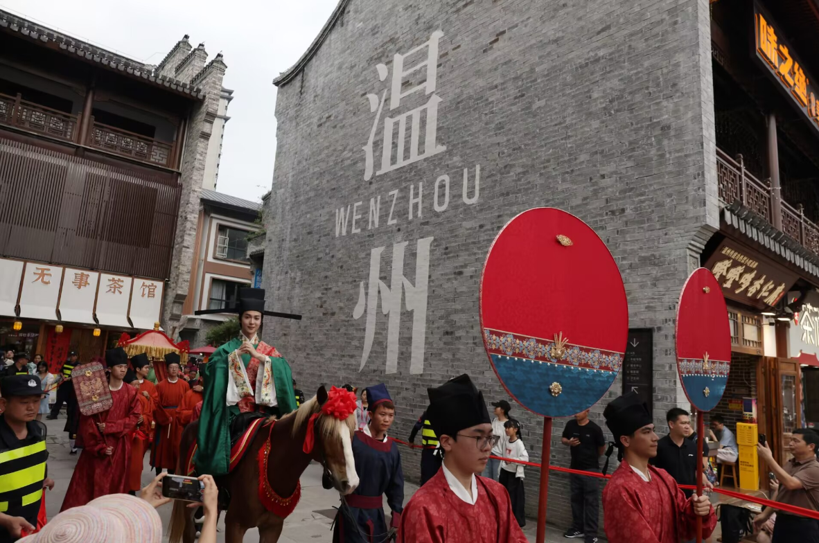 5月24日,温州市区梧田老街化身为宋韵流转的时光长廊,一场以“梧田喜事 宋韵婚俗”为主题的水上汉婚大典在此处盛装举行。摄影: 郑鹏