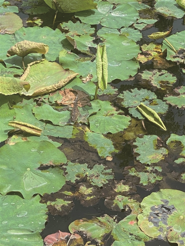 网友拍摄的视频画面显示,在九山湖密集的荷叶间,一条小生物若隐若现,其背部鳞片与鳄鱼极为相似。有网友评论:“如果是扬子鳄倒是没关系,若是外来物种短吻鳄,只需两年时间就能长到成人大小,对市民绝对是个威胁,要及时处理!”