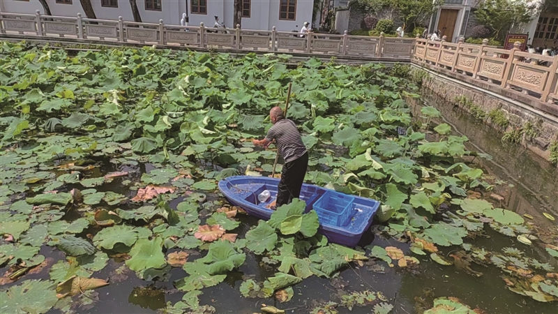昨天下午,在九山湖巡查的工作人员与拍摄者小曾一起,发现鳄鱼的踪迹,试图再次捕捞。但由于该鳄鱼体型较小且栖息区域荷花密集、藏身环境复杂,最后还是无功而返。