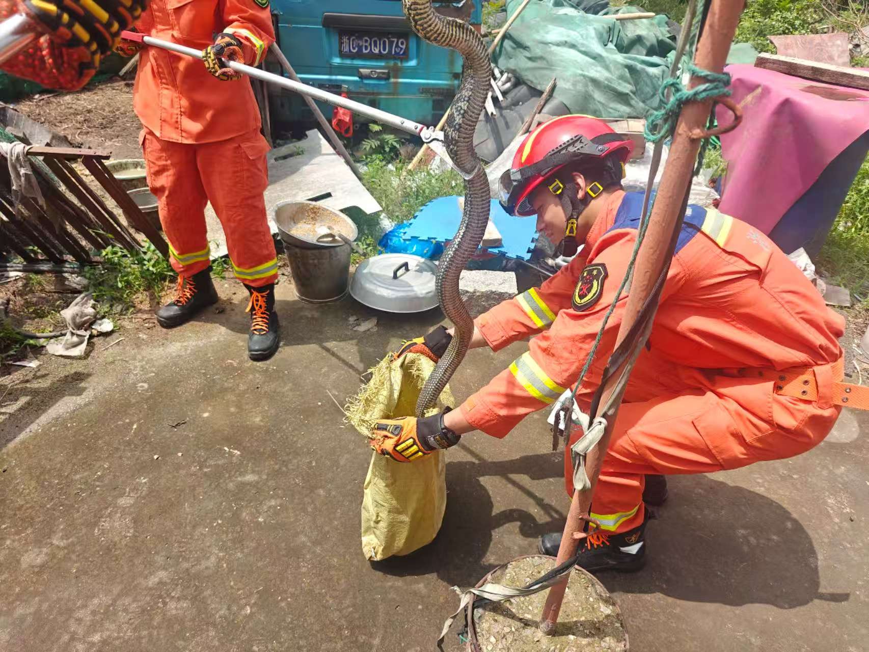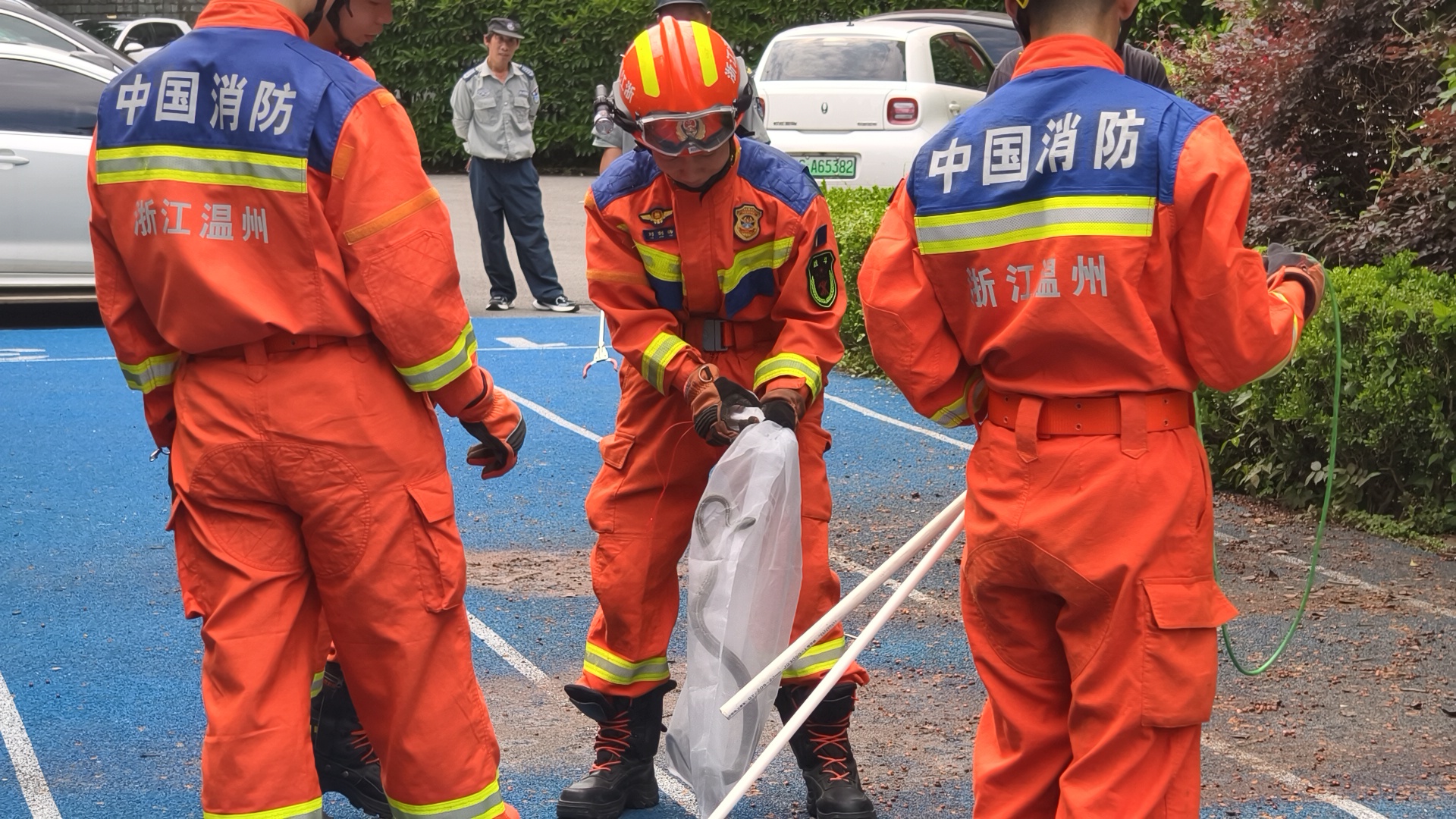 在鹿城区,蛇类活动同样频繁。5月22日上午,丰门街道后江路一学校操场发现一条1.2米长的银灰色蛇,引发师生恐慌。消防员到场后,穿戴专业防护装备,利用捕蛇夹精准控制蛇头与蛇尾,最终将其安全捕获并放归山林。据统计,近10天来,鹿城区消防救援大队已接到7起蛇扰民警情。