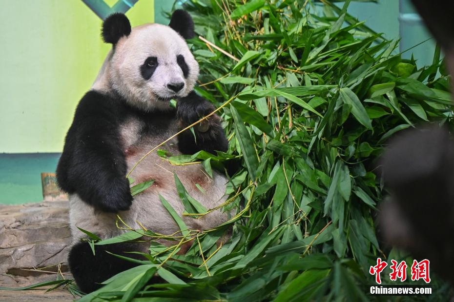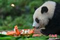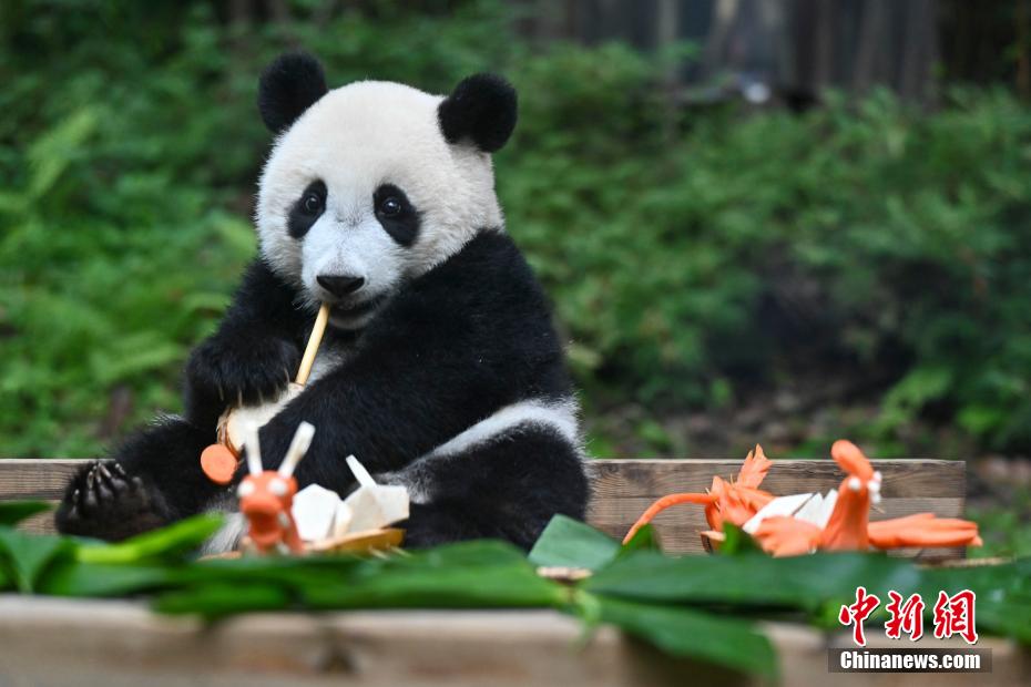 5月29日,大熊猫幼崽“妹珠”享用特制“端午大餐”。当日,广州长隆野生动物世界保育员用胡萝卜、竹子为大熊猫“萌萌”母女制作“端午大餐”。全球唯一大熊猫三胞胎中的大姐“萌萌”于2024年6月18日凌晨在长隆野生动物世界产下“妹珠”。中新社记者 陈骥旻 摄
