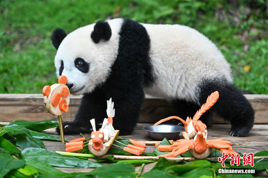5月29日,大熊猫幼崽“妹珠”享用特制“端午大餐”。当日,广州长隆野生动物世界保育员用胡萝卜、竹子为大熊猫“萌萌”母女制作“端午大餐”。全球唯一大熊猫三胞胎中的大姐“萌萌”于2024年6月18日凌晨在长隆野生动物世界产下“妹珠”。