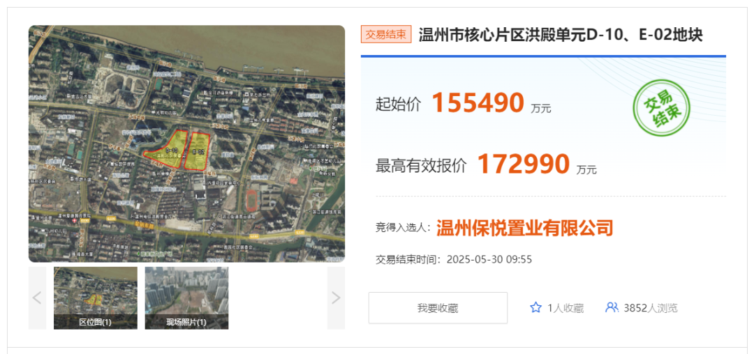 位于江滨街道的温州市核心片区洪殿单元D-10、E-02地块以11.25%的溢价率成功出让——两大房地产央企保利和招商联合以超17亿元的总价竞得该地块,成交楼面价约1.7万元/平方米。