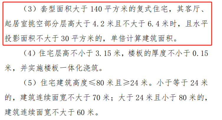 值得一提的是,出让须知中指出:“套型面积大于140平方米的复式住宅,其客厅、起居室挑空部分层高大于4.2米且不大于6.4米时,且水平投影面积不大于30平方米的,单倍计算建筑面积。”