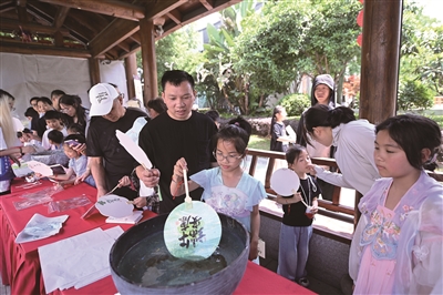 “妙趣端阳·端午文化市集”同样人气火爆。漆扇、米塑、屏纸版画等非遗项目让人大开眼界;“礼乐投壶”“射五毒”“钓粽子”等互动游戏妙趣横生,孩子们笑声连连。张女士一边陪孩子参与游戏一边说:“孩子玩得开心,还学到了传统文化的知识,真是一举多得。”