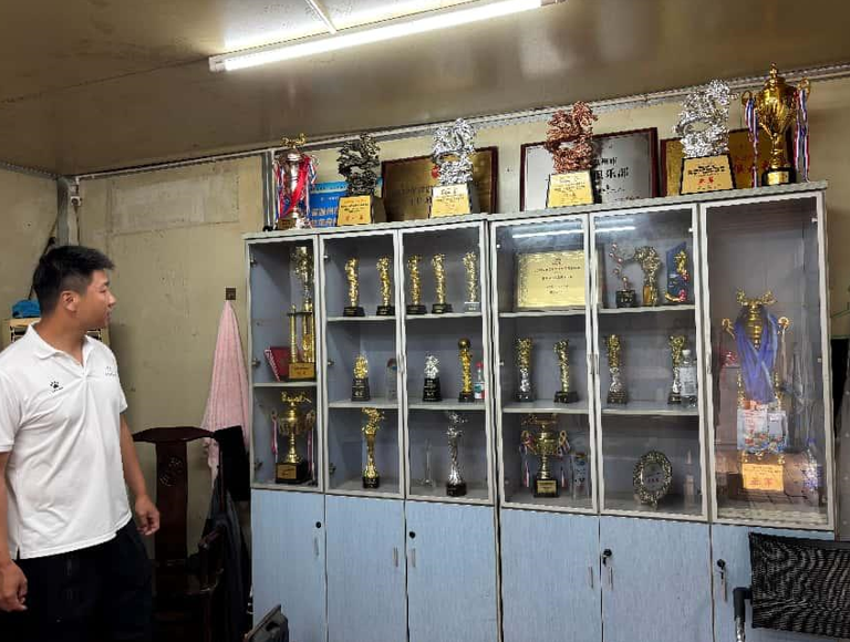 但对张云斌而言已是轻车熟路。经过桥边一道队员自己焊的铁门,便可下行至稍显简陋的半露天训练基地。岸边摆放着跑步机、杠铃、龙门架等撸铁健身设备,也备有蛋白粉和外文跌打药膏。集体生活的气息亦可见,餐桌、蒸笼和大锅电饭煲和啤酒都有,还有两张麻将桌,队员的拖鞋、训练服、吹风机随意放着。他们最珍视的是办公室内一墙的奖杯和成排的龙舟。俱乐部栖身在桥洞下正是为了方便存放超长的龙舟。