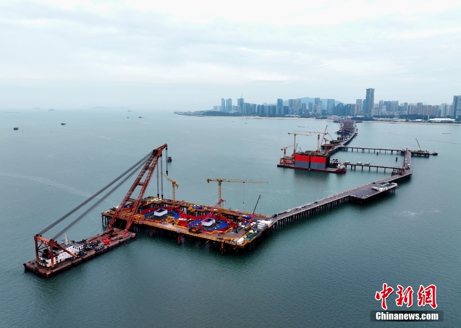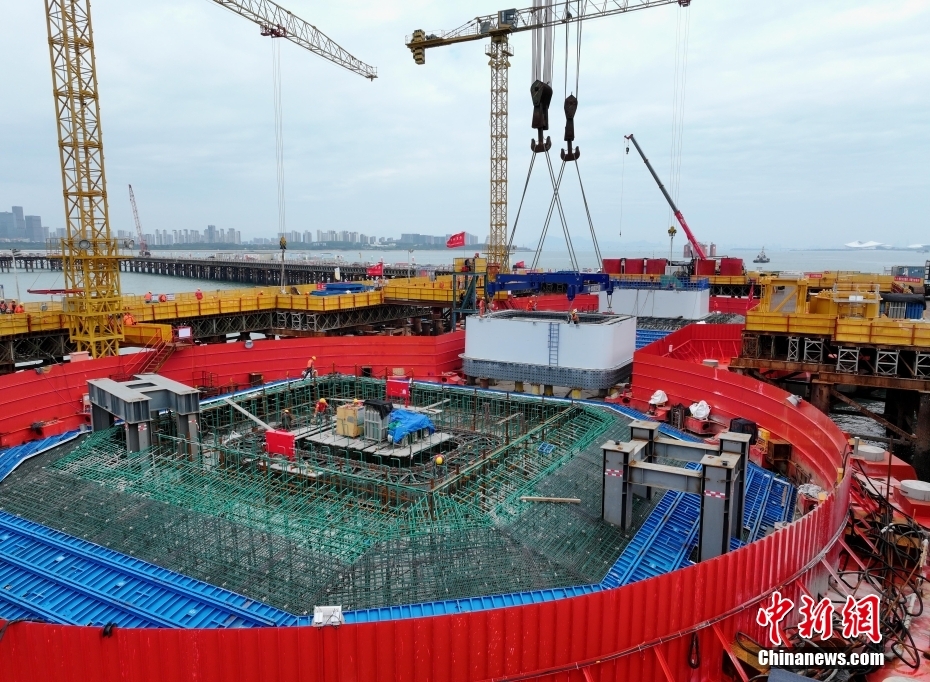 5月31日,福建厦门,厦金大桥(厦门段)刘五店航道桥西主塔首节段顺利落位,标志着西主塔开启“长个”模式,正式进入塔柱施工阶段。厦金大桥(厦门段)项目主线长约17.34公里。刘五店航道桥是该项目控制性工程,全长1948米,两座主塔高178.1米,主跨928米,是福建省内最大跨径桥梁,也是福建省首座全离岸式海中悬索桥。(无人机照片)中新社发 中交二航局 供图