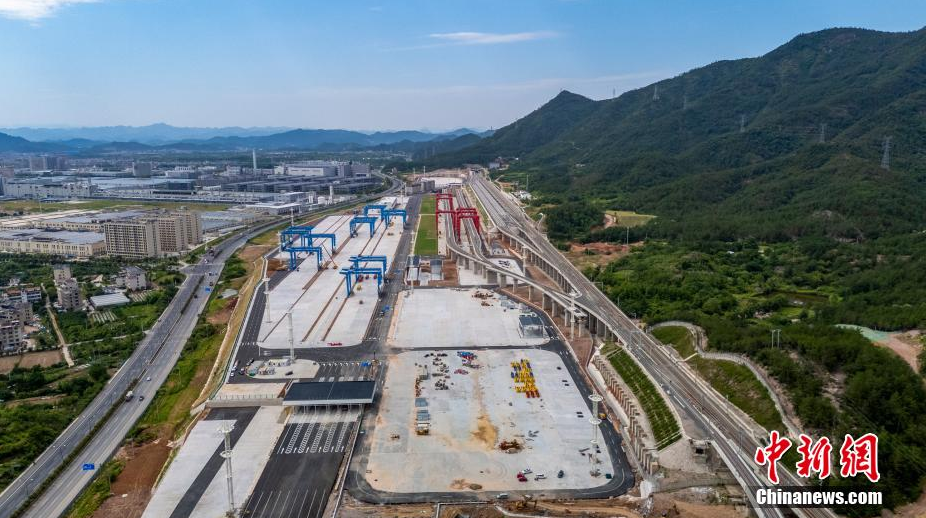 6月5日,俯瞰建设中的义乌(苏溪)国际枢纽港。位于浙江的义乌(苏溪)国际枢纽港是义甬舟开放大通道的支撑性项目,是宁波舟山港“第六港区”的核心载体,目前项目主体工程基本完成,大型设备正在安装调试。(无人机照片)胡肖飞 摄