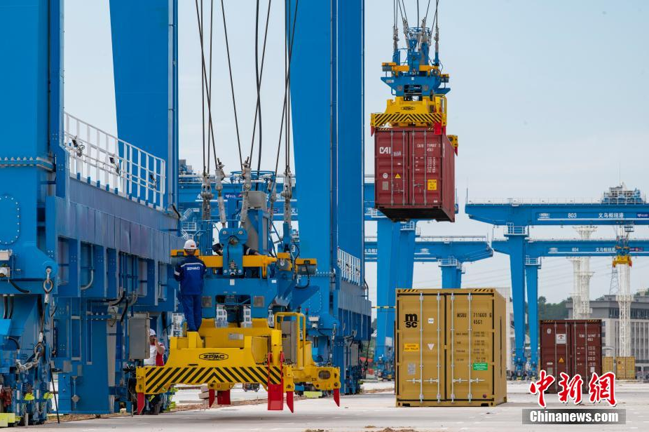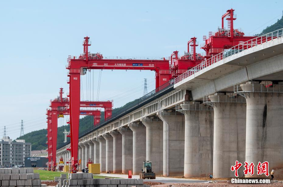 6月5日,义乌(苏溪)国际枢纽港进行设备安装调试。位于浙江的义乌(苏溪)国际枢纽港是义甬舟开放大通道的支撑性项目,是宁波舟山港“第六港区”的核心载体,目前项目主体工程基本完成,大型设备正在安装调试。胡肖飞 摄