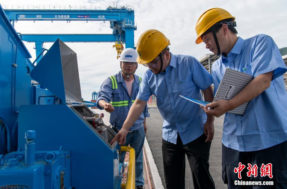 6月5日,工作人员对轨道式集装箱门式起重机进行监督检验工作。位于浙江的义乌(苏溪)国际枢纽港是义甬舟开放大通道的支撑性项目,是宁波舟山港“第六港区”的核心载体,目前项目主体工程基本完成,大型设备正在安装调试。胡肖飞 摄