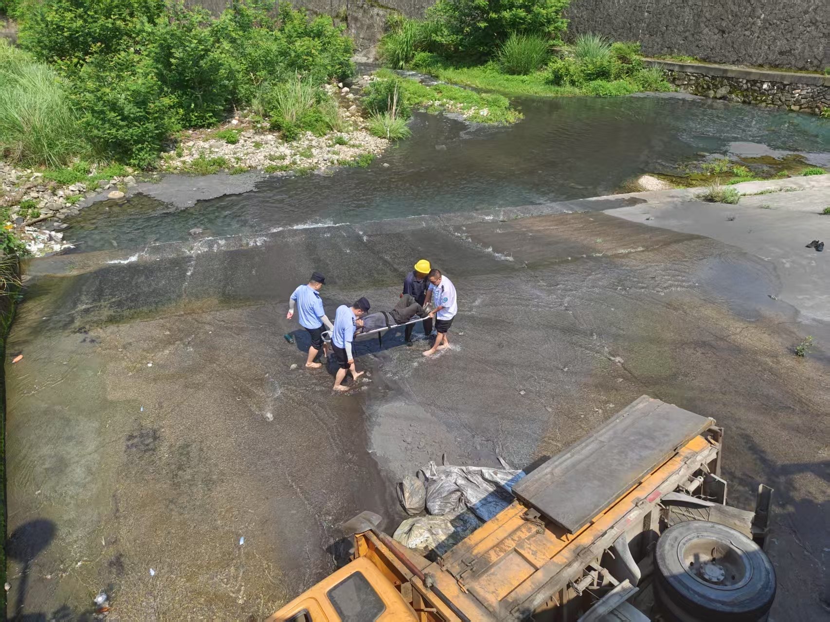 此时,一位头戴黄色安全帽的村民主动下水加入救援,担架在众人配合下被缓缓抬起。夏林海不断提醒:“慢一点,脚踩稳。”一边是湍急的溪流,一边是随时有滑动风险的卡车,大家紧紧抬着担架,挪动得格外小心。