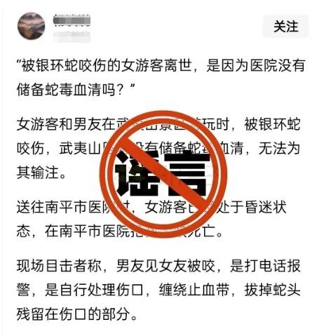 “一女游客来武夷山游玩被银环蛇咬伤致死”?当地辟谣