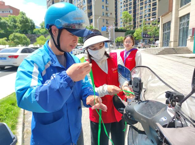 泰顺县委社会工作部还联合“瓯江红”罗阳城市驿站发起绿丝带护航高考专项行动,动员饿了么、美团、京东等平台50多名外卖配送骑手组建骑心协力志愿服务队,成立应急护航车队。外卖骑手配送电瓶车统一系上象征畅通与关爱的绿丝带,这些车辆在高考期间将作为流动保障站,为遭遇忘带证件、交通拥堵等紧急情况的考生及家长提供免费应急接送服务。流动的绿丝带不仅是随时守护的承诺标识,更凝聚着社会各界对考生平安应考的深切关怀,成为城市治理风景线中温暖的注脚。