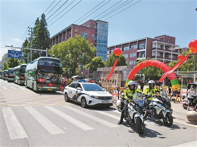今年大荆中学有231名高考考生,学校为此专门租赁5辆大型客车安排考生统一前往考点。为了保障学子们能够顺利地参加高考,乐清市公安局交警大队大荆中队组织警力,做好学校周边交通秩序维护工作,并特意借调了车牌尾号为“985”的警车护送考生。