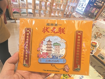 在饱塔文创店,记者看到,“江心屿状元联”冰箱贴成了不少中高考考生家长争相购买的爆款。正在选购的市民陈阿姨说:“相比普通的纪念品,这类文创既有文化底蕴,还能激励孩子,图个好彩头。”