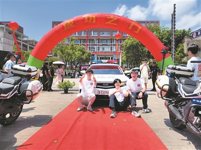 考生与“985”警车合影讨个“好彩头”
