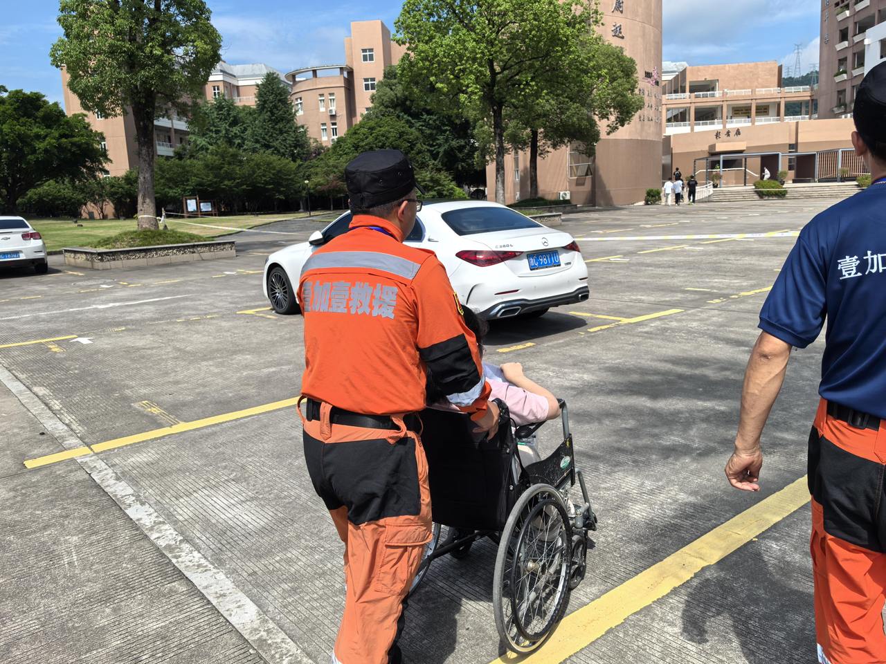 6月9日一大早,平阳县壹加壹救援队的志愿者便提前抵达考点,等候考生王子涵。“先来这里休息下,喝口水,时间到了我们送你进考场。”当王子涵到达时,身着统一服装的志愿者立即上前:一人推轮椅、两人扶稳两侧,还有两人提前探查路线,确保道路畅通。