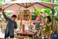 6月8日,在重庆市渝中区山城巷的一家露天茶馆,茶艺表演者与游客互动。