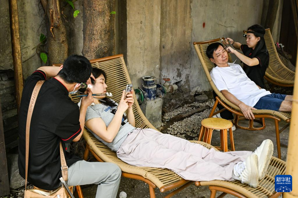 6月8日,游客在重庆市渝中区山城巷体验采耳服务。