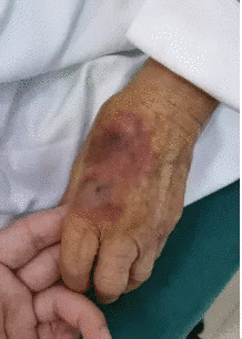 救护车赶到现场后,120急救医生发现陈阿婆左手虎口处有两个明显的蛇齿痕,周围已经开始肿胀,医生一边安慰阿婆,一边松开阿婆衣袖,用清水冲洗伤口后,妥善包扎伤口,保持制动。在完成这些初步急救措施后,以最快的速度将老人送往具有蛇毒血清的温州市人民医院蛇伤救治中心进行救治。