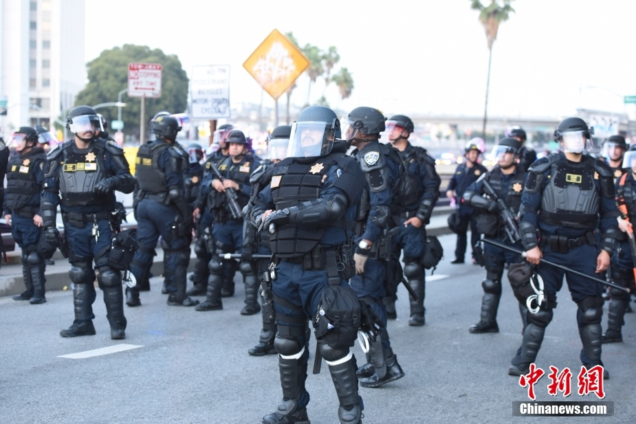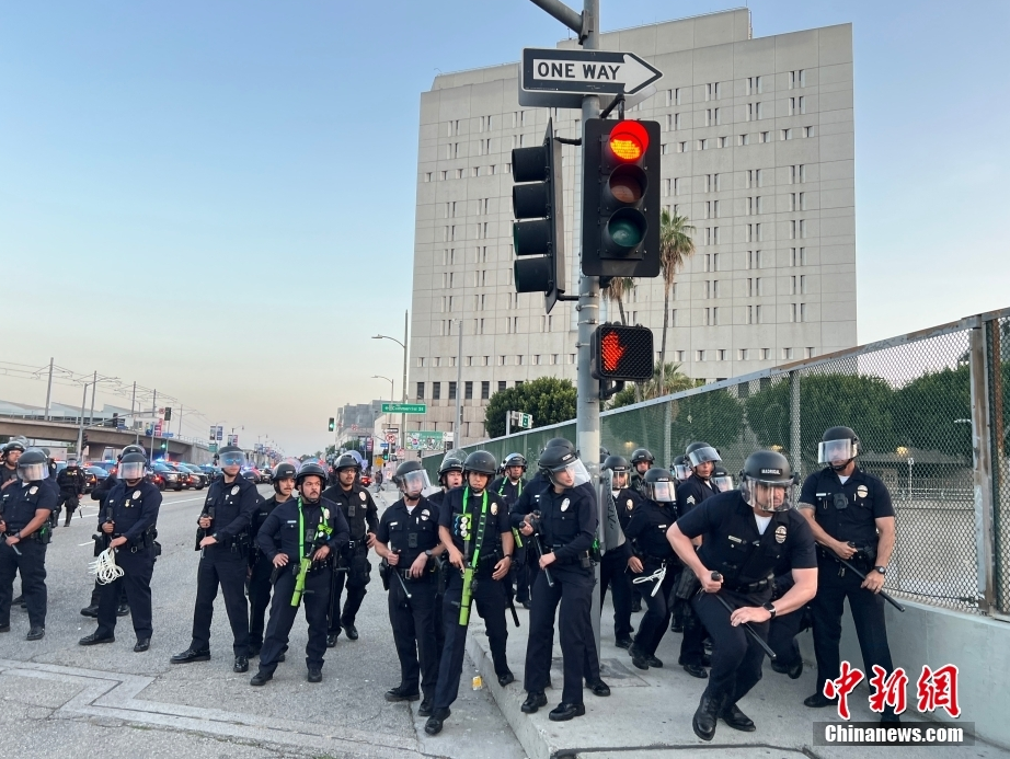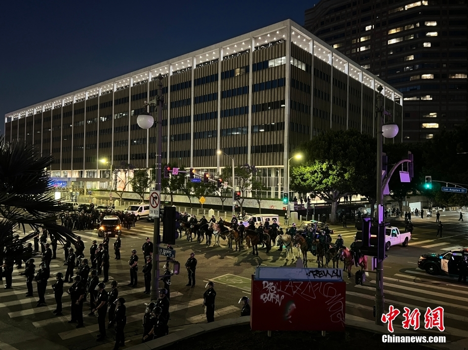 当地时间6月10日晚8时许,美国加利福尼亚州洛杉矶市中心部分区域开始实施宵禁。警方强力驱散不肯离去的抗议者,现场一度爆发激烈冲突。洛杉矶市长凯伦·巴斯10日宣布,鉴于当前出现紧急状态,即日起从晚8时至次日晨6时,在洛杉矶市中心部分区域实施宵禁,以阻止抢劫和破坏。中新社记者 张朔 摄