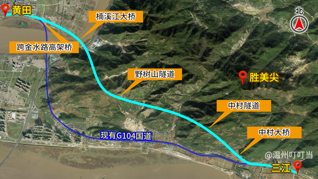 这条快速路即104国道三江至黄田段改建工程,顺接七都大桥北汊桥互通,起点位于永嘉三江街道挂彩村,终点接现状104国道千石互通,全长7.754公里,主线按双向6车道标准设计,设计速度80公里/小时,由永嘉县建设投资集团有限公司投建,总投资约19.35亿元。