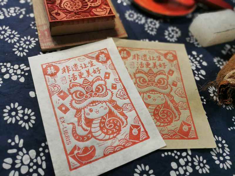 木版画藏书票《非遗让生活更美好》,将传统技艺与现代商业气息熔铸于方寸之间。画面中央,腾跃的舞狮与灵动的灵蛇相映成趣,既点明乙巳年的生肖特色,又彰显非遗文化的蓬勃生命力。四周环绕的祥云纹样、象征财富的元宝与承载祝福的红包,在传递传统吉祥寓意的同时,烘托出浓厚的节庆氛围。醒目的“非遗让生活更美好”字样贯穿画面,将非遗传承的时代愿景化作具象表达。