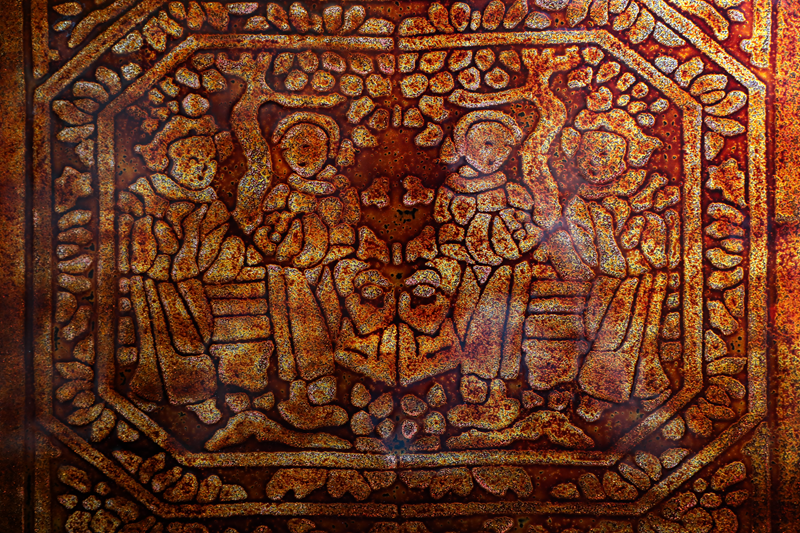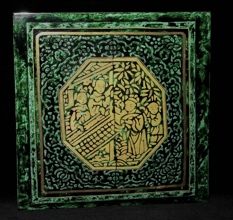 画面以温州蓝夹缬纹样为精髓,借绿宝砂工艺与堆高技法构筑立体基底,经金银箔贴饰与多层绿色透明漆髹涂,形成深邃的视觉层次。环绕主画面的花草边饰,在浓绿底色与金银交织的光影中,似海底龙宫摇曳的珊瑚丛,为这段仙凡之恋渲染出神秘瑰丽的奇幻氛围。