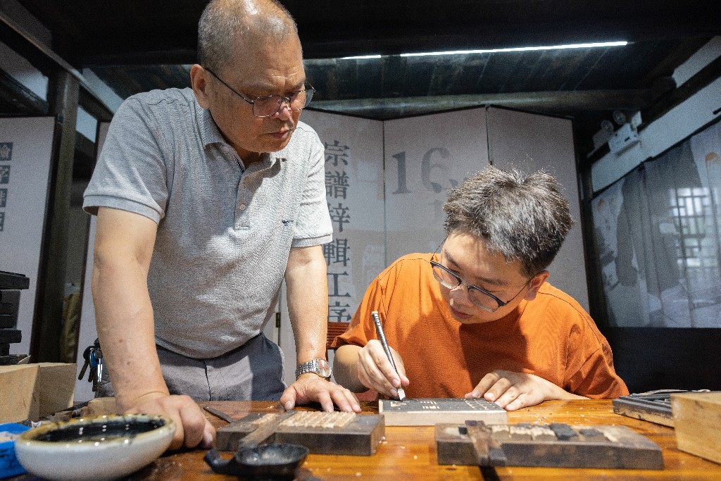 潘昱丞向浙江省木活字印刷代表性传承人吴魁兆学习木活字印刷传统工艺。