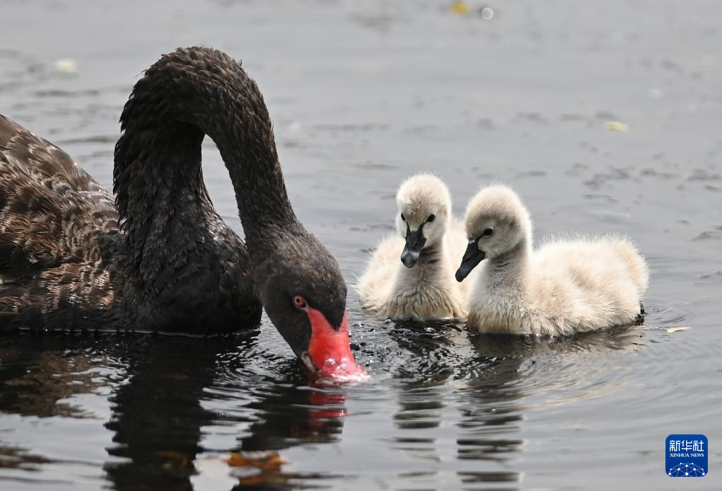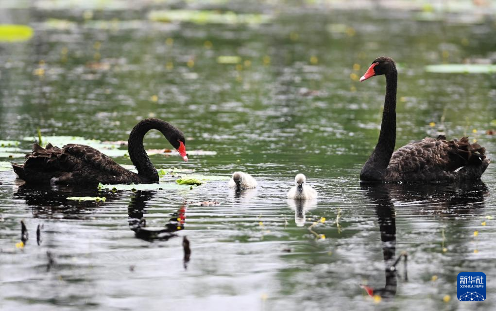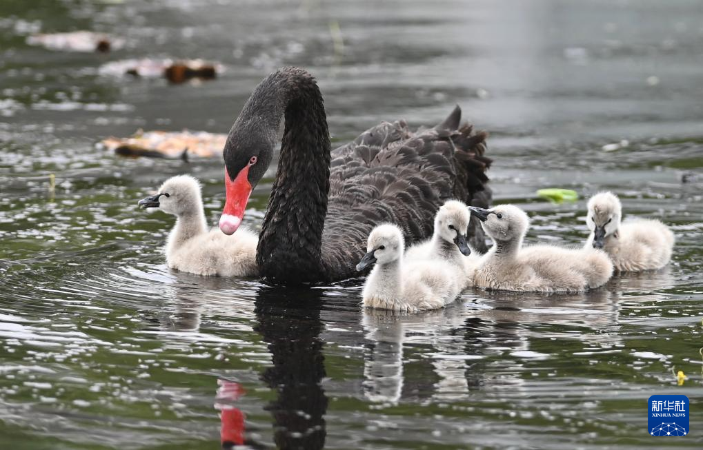 近日,在山东滕州微山湖红荷湿地景区,一对黑天鹅夫妇喜添新丁,自然繁殖的五只天鹅宝宝紧随亲鸟在水中游弋觅食。