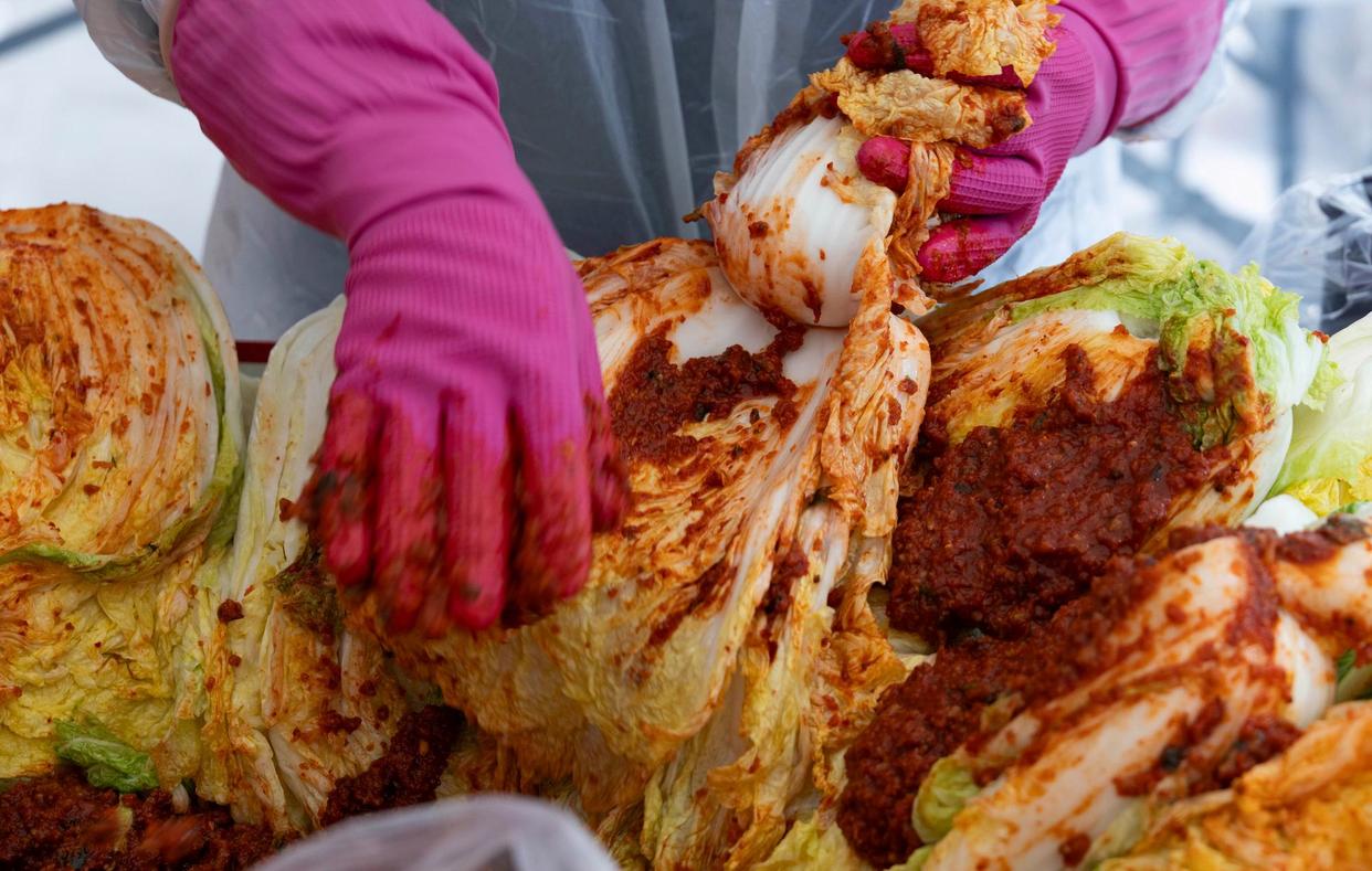2024年11月27日,人们在韩国首尔的曹溪寺集体制作泡菜。新华社发(全休相摄)