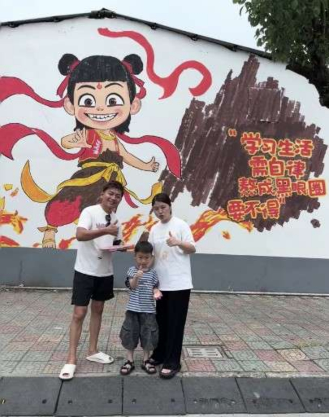 从早上到傍晚,经过连续十余个小时的奋战,终于一幅长约10余米、高约5米色彩斑斓、充满活力的“哪吒”墙绘作品呈现在眼前。墙绘右下角那句“学习生活需自律,熬成黑眼圈要不得”的励志标语,更是为这幅作品增添了几分俏皮与深意,仿佛在无声地激励着每一位路过的学子,要像哪吒一样勇敢无畏,同时也要注重学习和生活的平衡。这幅哪吒墙绘作品吸引了不少村民的目光。有孩子妈妈带着小朋友邀请“我不叫土豆”一起站在哪吒墙绘前合影。镜头下的小朋友眼睛里闪烁着惊喜的光芒……。