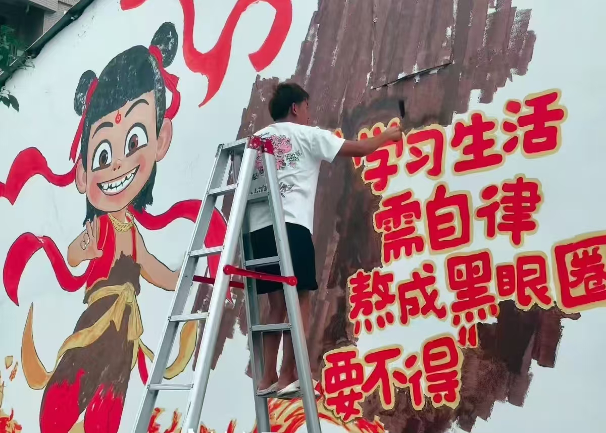 网红画师10小时高温创作“哪吒”墙绘成乡村校园励志风景线