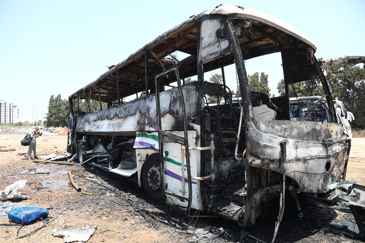 6月17日,在以色列中部城市海尔兹利亚,一辆巴士在导弹袭击中损毁。新华社发(吉德翁·马科维奇摄/基尼图片社)