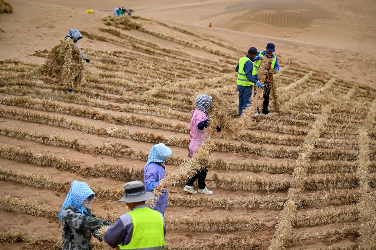 治沙工人在宁夏中卫市境内的腾格里沙漠铺设刷状网绳式草方格沙障。新华社记者 冯开华 摄