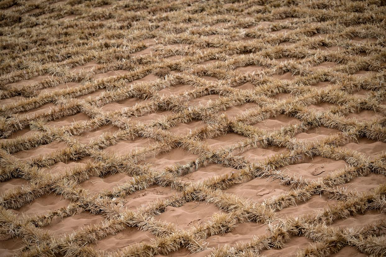 这是在腾格里沙漠铺设的刷状网绳式草方格沙障,固沙时间最长可达6年。新华社记者 冯开华 摄