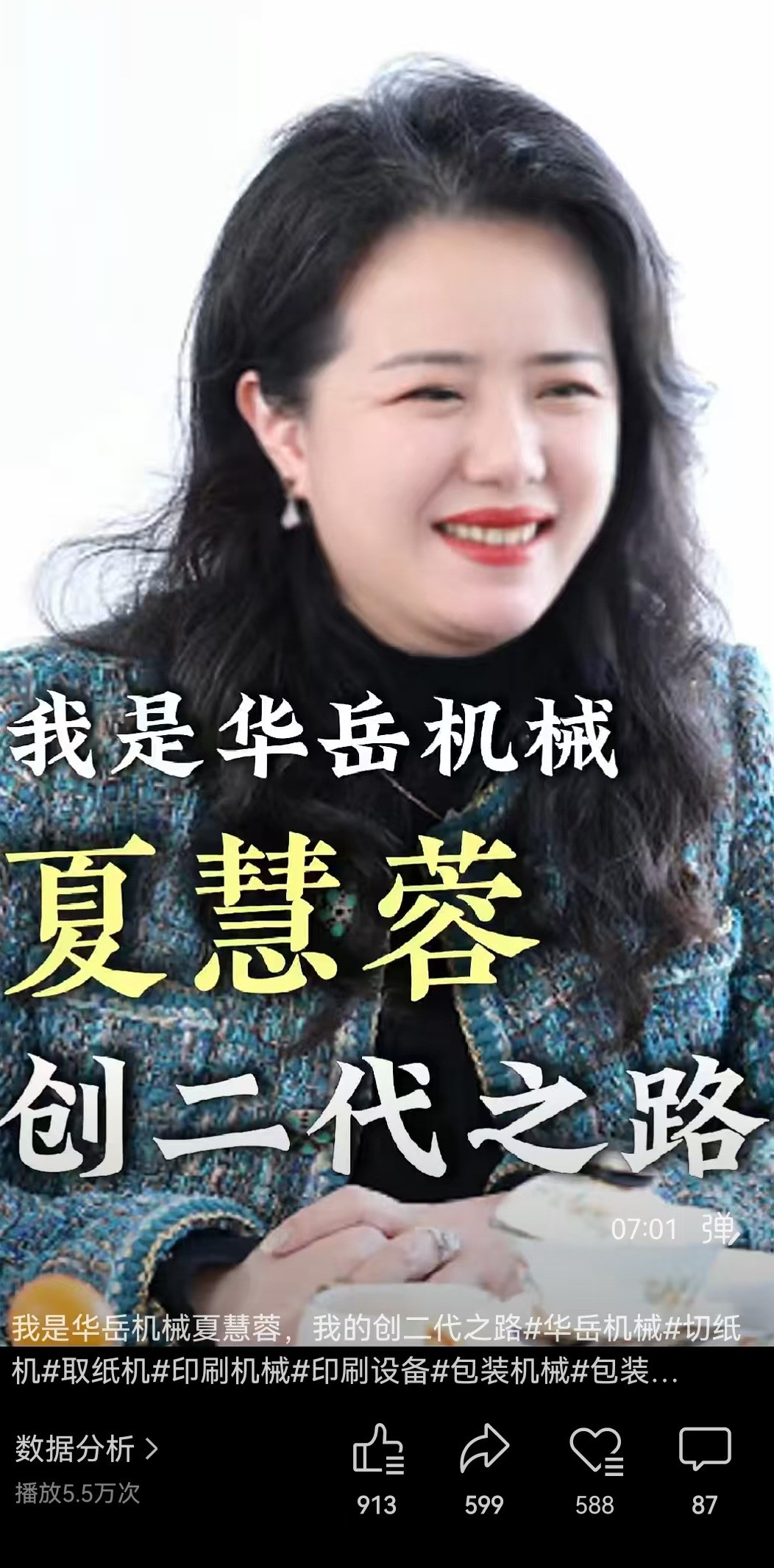 今年3月,夏慧蓉在同行的带领下,当上了企业“主播”,开启了短视频营销之路。从3月份至今,她共发布了34条短视频,其中《我是华岳机械夏慧蓉:我的创二代之路》单条视频播放量突破11万次,整个系列视频累计播放量超60万人次,直接或间接为企业带来超10%的客户增量。