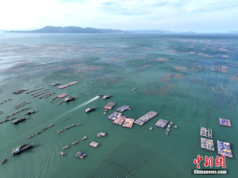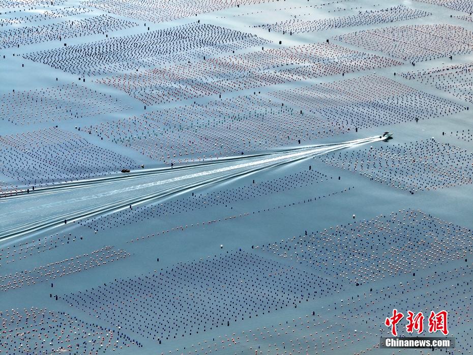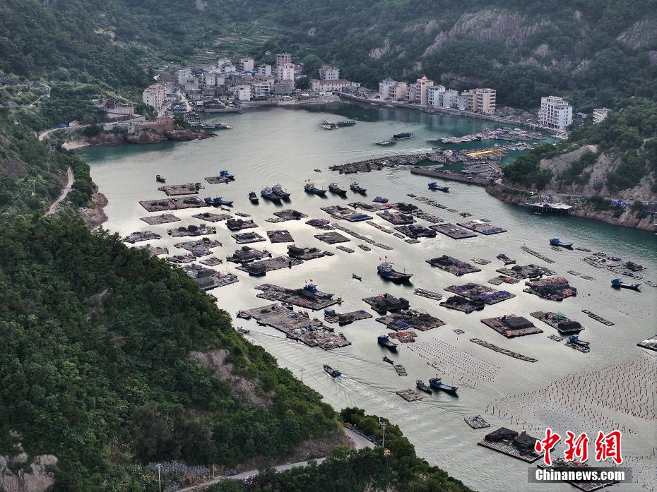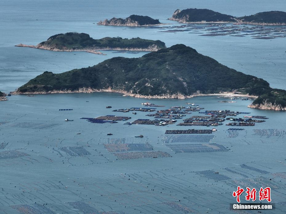6月21日,眼下正是夏鲍丰收季,在福建省福州市连江县松芦湾海域1.2万亩鲍鱼养殖区,一幅生机勃勃的“海上丰收图”正徐徐展开。(无人机照片)中新社记者 张斌 摄