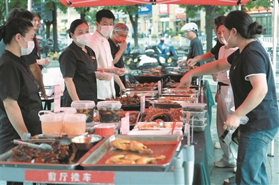 连日来,这一“接地气”的外摆模式为炎炎夏日中不愿下厨的上班族带来了便捷和美味,因而迅速吸引了附近不少市民的眼球。一位家住白麓里的市民笑着说:“这些卤味、热菜特别好吃,我每天都来买。”她表示,外摆服务让她在大热天里省去了买菜做饭的麻烦,而且价格实惠,品质也有保障。