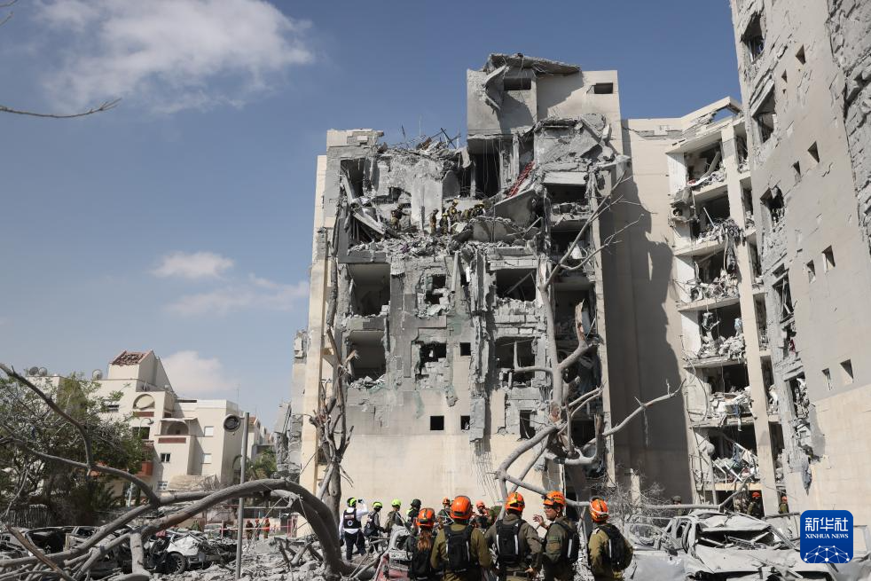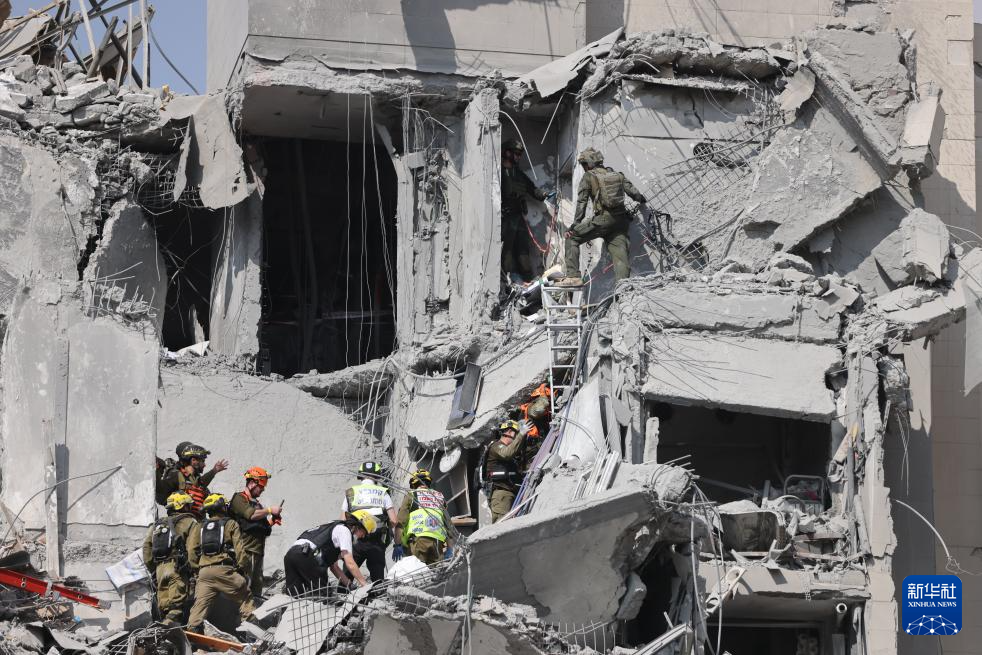 6月24日,应急和救援人员在以色列南部贝尔谢巴的导弹袭击现场开展工作。