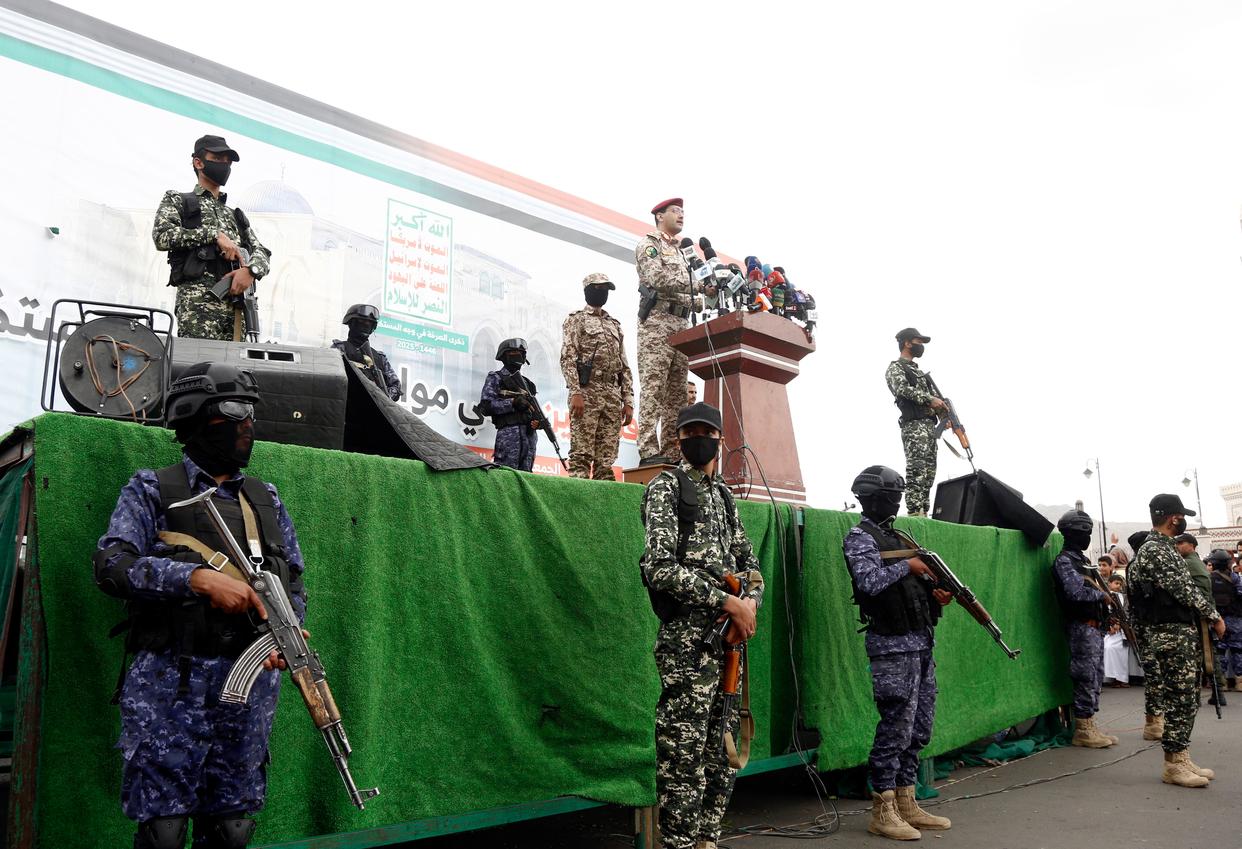 5月2日,也门胡塞武装发言人叶海亚·萨雷亚在首都萨那发表讲话。新华社发(穆罕默德·穆罕默德摄)