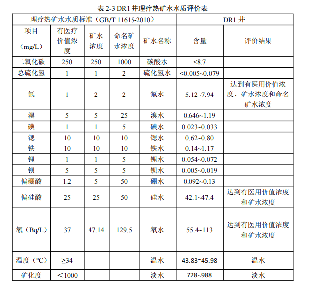 该项目位于洞头区北岙街道小朴村,井深2000米,地热水井口温度43.83℃~45.98℃,日最大出水流量108立方米,年生产规模2.7万立方米。经检测,该热矿水氟含量为5.12~7.94mg/L,氡含量为55.4~113Bq/L,偏硅酸含量为42.1~47.4mg/L,达到矿水浓度,并含有溴、碘、锶、铁、锂、钡等多种对人体有益的元素可直接用于温泉洗浴、医疗保健等。