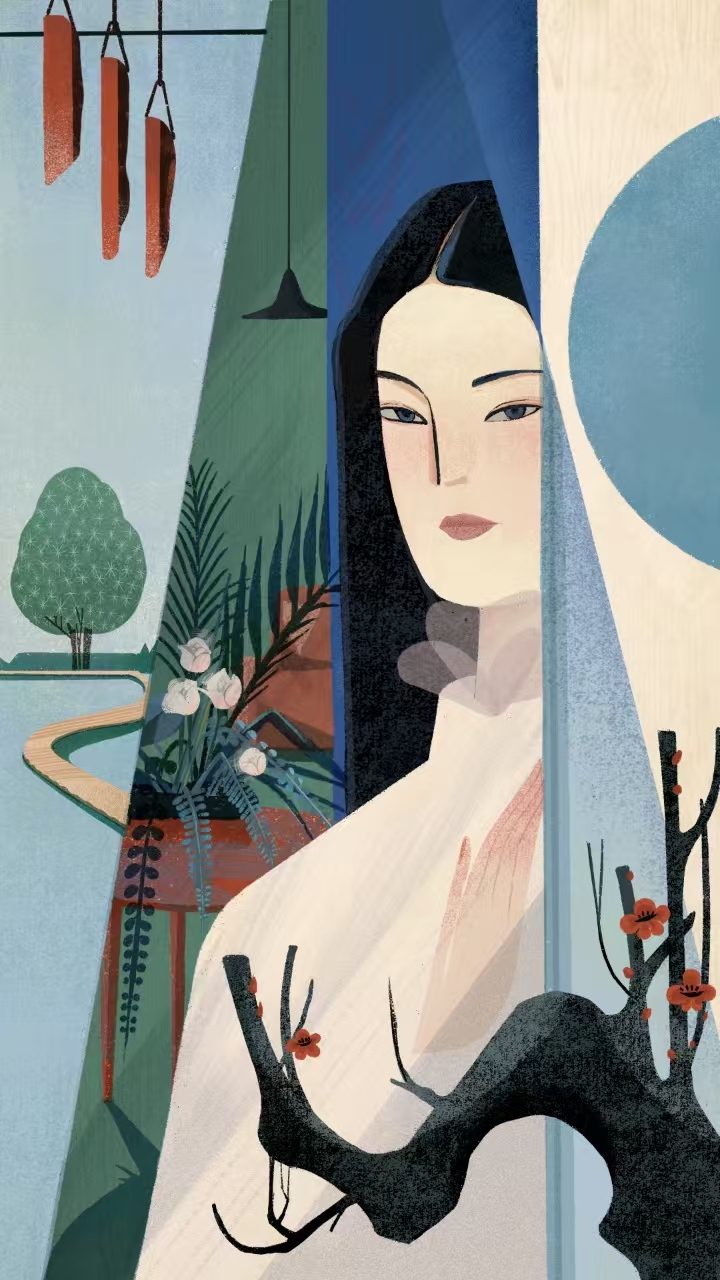 从版画转向插画的初期,她曾陷入风格困惑,直到导师点醒“融合所有学过的元素”,才催生了代表作《唐朝仕女图字母表》——26个英文字母被解构为唐代仕女的动态身姿,A形是俯身浣纱的弧度,J形是执扇前行的曲线,既保留了张萱画作中女性的自由气质,又融入西方设计的构成美学。这组作品不仅让西方导师惊叹于其文化融合的巧思,还入围了2021—2022CIB8第八届全国插画双年展入围奖。