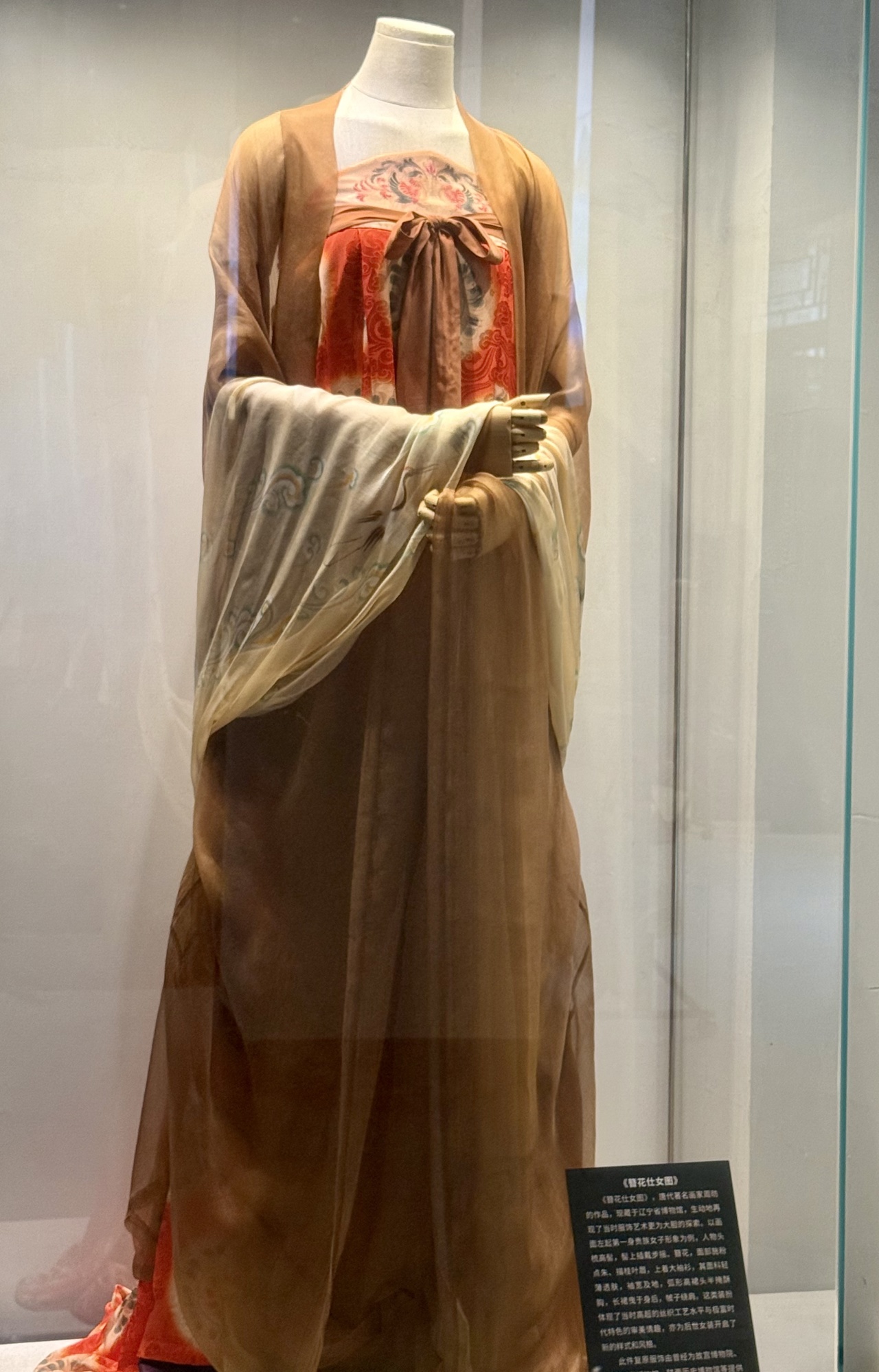 步入展览馆,三层空间构成立体的文化认知图谱。一层“华服霓裳”以故宫级复原水准呈现——汉代曲裾的厚重织锦、唐代襦裙的晕染工艺,均出自曾服务于央视的装束复原团队。现场陈列着宣化辽墓壁画《女孝经图》女俑、襄阳《南朝齐梁墓画像》砖女俑的复原服饰,还有唐代周昉《簪花仕女图》、宋徽宗赵佶《听琴图》中人物服饰的复刻品。