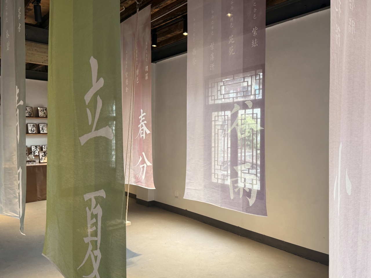 二层“节气与色”是流动的色彩盛宴。微微透明的各色布料自天花板垂落,每块布上印着节气名称,地面铺着仿真草坪,中央悬挂的秋千更添灵动。春分对应的“紫磨金”“檀色”,清明专属的“冻缥”“春碧”,谷雨特有的“昌荣”“紫薄汗”,这些诗意色彩将古人对四季流转的感知具象化。“古人看草木枯荣、节气更迭,都能用色彩描绘,这是东方美学独有的细腻。”陈彤说。