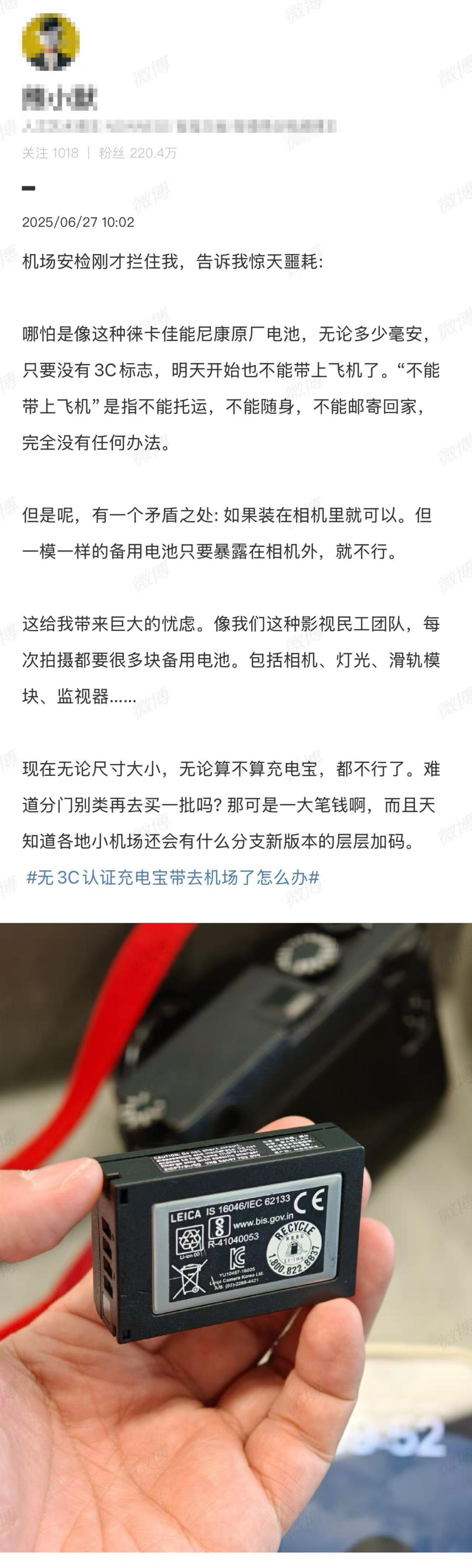 6月27日,“相机电池不能上飞机”登上热搜,有网友称在上海机场登机时被拦。