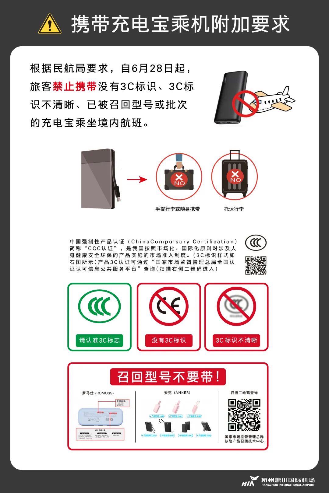 问:罗马仕品牌的充电宝,不在召回的批次和型号,可以带吗?答:关于不在召回型号和批次,但属于召回品牌的充电宝,只要符合3C规定,也是可以携带的。问:国际航班携带的充电宝有这个要求吗?答:目前新规针对国内航班,国际航班仍执行之前的要求。问:我的充电宝有3C标识,但比较小,可以带吗?答:只要能看清,能识别3C标识,符合规定就可以携带。但如果标识显示不清晰,也是禁止携带的。问:对于不符合规定的充电宝,只能丢弃吗?机场是否可以寄存,乘客回程时领取?答:如果旅客充电宝不符合携带要求,可以选择由送行人员带回、快递、暂存或者放弃携带。关于是否可以寄存,杭州机场正在研究寄存相关的细则和时间。